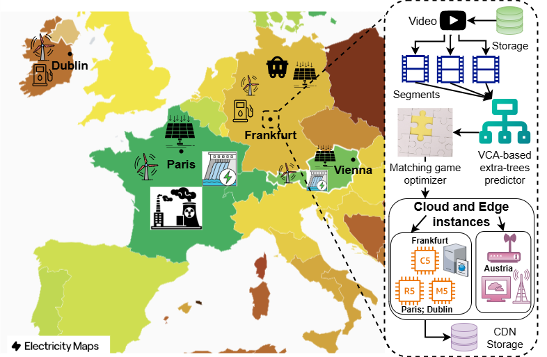 Abstract: The rapid expansion of video traffic has made it one of the most energy-intensive workloads on cloud and edge infrastructures. As encoding remains essential for streaming, gaming, and immersive applications, efficient task scheduling is required to balance service quality, cost efficiency, and sustainability. In this work, we propose a sustainable scheduling framework that integrates machine learning–based performance prediction with game-theoretic matching (X4-MATCH), designed to distribute video encoding workloads across cloud–edge infrastructures. The framework formulates four key performance metrics, including processing and transmission time, price, energy use, and CO2 emissions, as optimization objectives to balance performance and sustainability goals. This method leverages the eXtra-trees regressor model to predict performance metrics for video encoding tasks, integrated with a Matching theory-based resource allocation strategy to efficiently utilize computational resources across cloud and edge computing resources. We experimentally validate the effectiveness of X4-MATCH on a real-world testbed incorporating Amazon Web Services (AWS) cloud virtual machines/instances and local edge servers. Results show that X4-MATCH outperforms state-of-the-art methods by reducing total time by 63.3%, price by 54.2%, and energy by 56.8%. The X4-MATCH implementation is publicly available at: https://github.com/anonymousuni/x4-match.