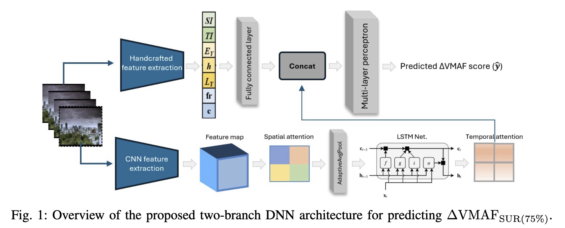 Abstract: Just Noticeable Difference (JND) thresholds, particularly for quality metrics such as Video Multimethod Assessment Fusion (VMAF), are critical in streaming, helping identify when quality changes become perceptible and reducing redundant bitrate representations. The Satisfied User Ratio (SUR) complements JND by quantifying the percentage of users who do not perceive a difference, offering practical guidance for perceptually optimized streaming. This paper proposes a novel two-branch deep neural network (DNN) for predicting the 75% SUR for VMAF, the encoding level where 75% of viewers cannot perceive degradation. The framework combines handcrafted features (e.g., spatial and temporal indicators such as SI, TI, etc. and deep learning-based (DL-based) representations extracted via a convolutional neural network (CNN) backbone. The DL-based branch employs a spatio-temporal attention mechanism and a Long Short-Term Memory (LSTM) to capture temporal dynamics, while the handcrafted branch encodes interpretable indicators through a fully connected layer. Both outputs are fused and passed through a lightweight Multilayer Perceptron (MLP) to predict 75% SUR. To improve robustness to noise and label uncertainty, the model is trained using the Smooth-L1 loss. Experiments on the VideoSet dataset show our method outperforms SOTA across all metrics, achieving a notably higher R² score (0.46 vs. 0.36), indicating improved prediction reliability and low computational complexity, making it suitable for real-time video streaming.